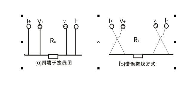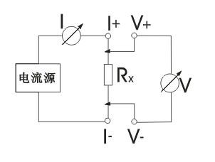 由電流源經(jīng)“I+、I-兩端口(也稱I型口),供給被測(cè)電阻Rx電流,電流的大小有電流表I讀出,Rx兩端的電壓降“V+、V-”兩端口(也稱V型口)取出,由電壓表V讀出。通過(guò)對(duì)I、V的測(cè)量,就可以算出被測(cè)電阻的阻值。
