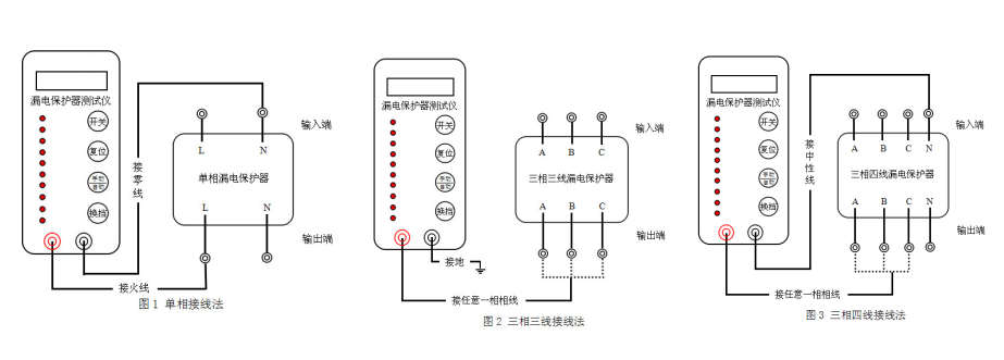 漏電保護器測試儀使用時接線示意圖說明及介紹: